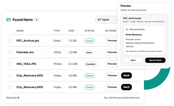 Our email recovery tool can retrieve your emails from the most commonly used storage devices in a few clicks.